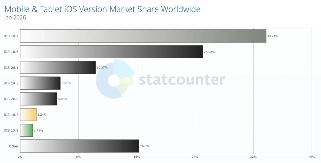 Nors pirmasis teiginys pasirodė esąs tiesa ir „Android“ brendai pradėjo kopijuoti nesėkmingas skystojo stiklo idėjas, antrasis buvo staigmena. Remiantis „StatCounter“ tyrimu matyri, kad „iOS 26“ diegimo lygis tarp „iPhone“ ir „iPad“ naudotojų buvo stulbinamai mažas. 2026 m. sausio mėn. į „iOS 26“ atnaujintų „iPhone“ dalis buvo vos 18,1 %. Palyginimui, metais anksčiau, 2025 m. sausio mėn., „iOS 18“ diegimo rodiklis siekė 63,25 %.