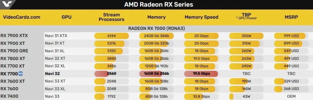 Pasak AMD, „RX 7700“ našumas yra maždaug 16–19 % mažesnis nei „RX 7700 XT“.