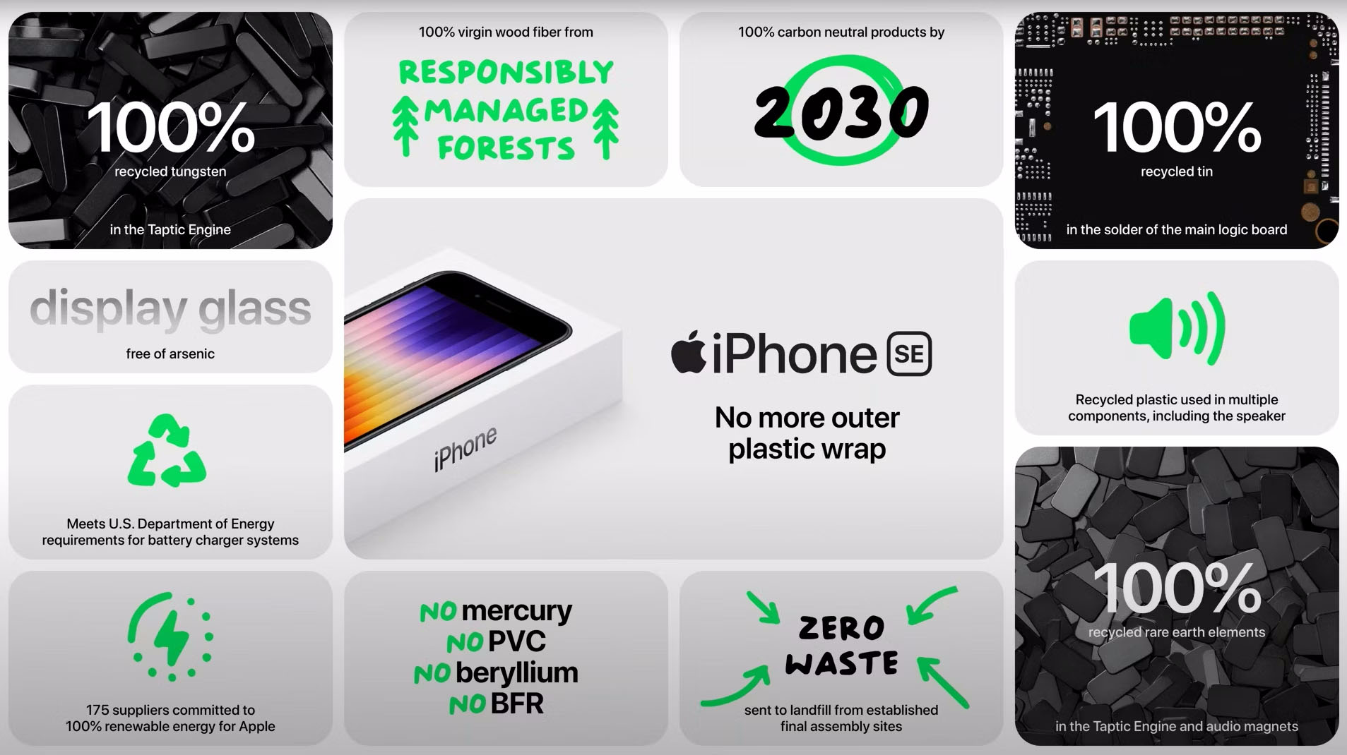 Apple jau daugelį metų stipriai akcentuoja savo „žalią“ įvaizdį ir produktų ekologiškumą. Prisidengdama rūpesčiu aplinka, bendrovė sumažino iPhone komplektaciją, todėl vartotojams tenka atskirai pirkti įkroviklius. Taip pat kiekvieno pristatymo metu skiriama nemažai dėmesio anglies emisijų mažinimui ir perėjimui prie atsinaujinančios energijos.