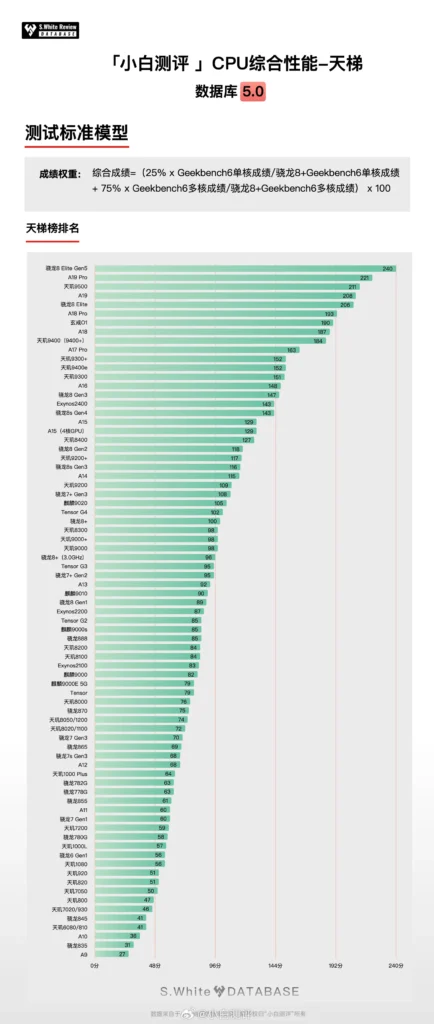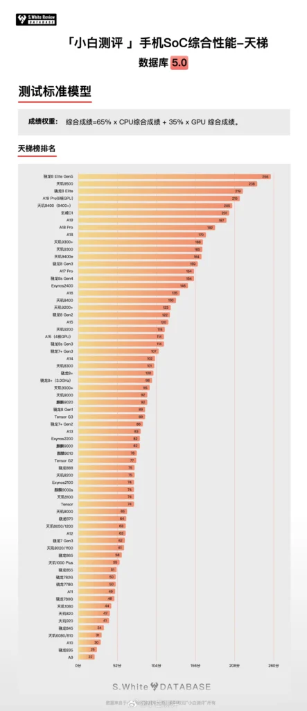 Išsamų ir vaizdų atsakymą į šį klausimą pateikė kinų technologijų apžvalgininkas S.White Review – jis surengė milžinišką testą su daugiau nei 70 populiariausių mobiliųjų lustų per pastaruosius metus. CPU sparta matuota Geekbench 6 teste, GPU – 3DMark teste. Kiekvienas lustas buvo testuojamas po 100 kartų, kad rezultatai būtų kuo tikslesni. Kaip atskaitos taškas pasirinktas Snapdragon 8+ Gen 1.
