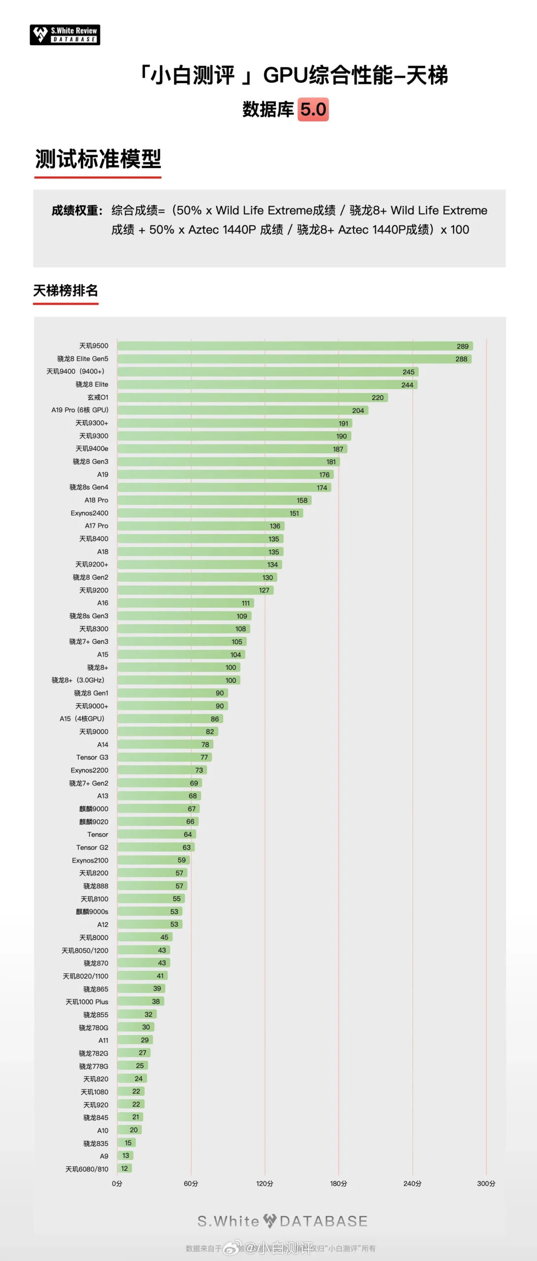 Išsamų ir vaizdų atsakymą į šį klausimą pateikė kinų technologijų apžvalgininkas S.White Review – jis surengė milžinišką testą su daugiau nei 70 populiariausių mobiliųjų lustų per pastaruosius metus. CPU sparta matuota Geekbench 6 teste, GPU – 3DMark teste. Kiekvienas lustas buvo testuojamas po 100 kartų, kad rezultatai būtų kuo tikslesni. Kaip atskaitos taškas pasirinktas Snapdragon 8+ Gen 1.