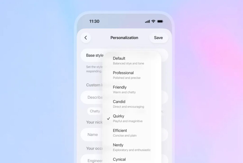 „OpenAI“ taip pat paskelbė apie GPT-5.1 „asmenybės“ išankstinių nustatymų išplėtimą. Bendrovė savo tinklaraščio įraše skelbia, kad galimų parinkčių sąraše dabar yra „Numatytasis“, „Profesionalus“, „Draugiškas“, „Atviras“, „Keistas“, „Efektyvus“, „Nuobodus“ ir „Ciniškas“.