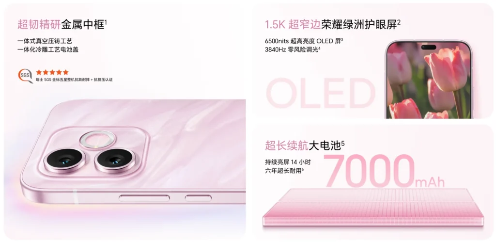 Baterija – 7000 mAh (6800 mAh nominali), palaikomas 45 W laidinis įkrovimas. Taip pat numatyta IP66 apsauga. Įrenginys veikia su MagicOS 10 (Android 16 pagrindu).