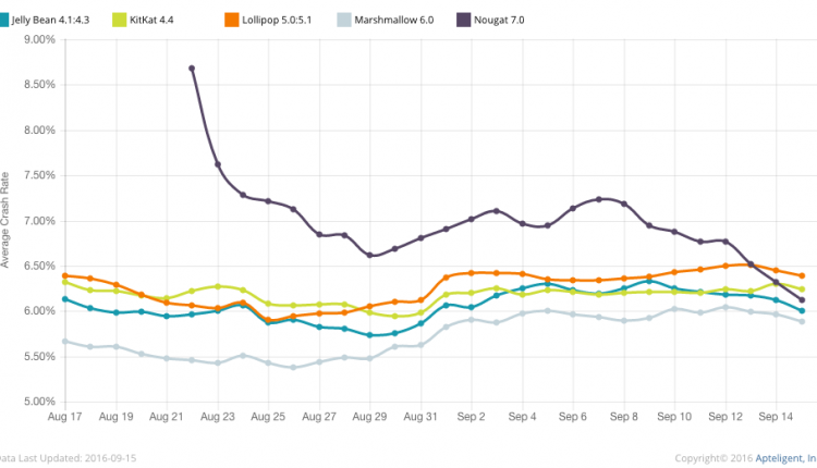 „Apteligent“ specialistai atkreipia dėmesį, kad vos tik pasirodžiusi „Marshmallow“ iškart tapo stabiliausia „Android“ versija, tuo tarpu „Android 7.0“ turi daug problemų.