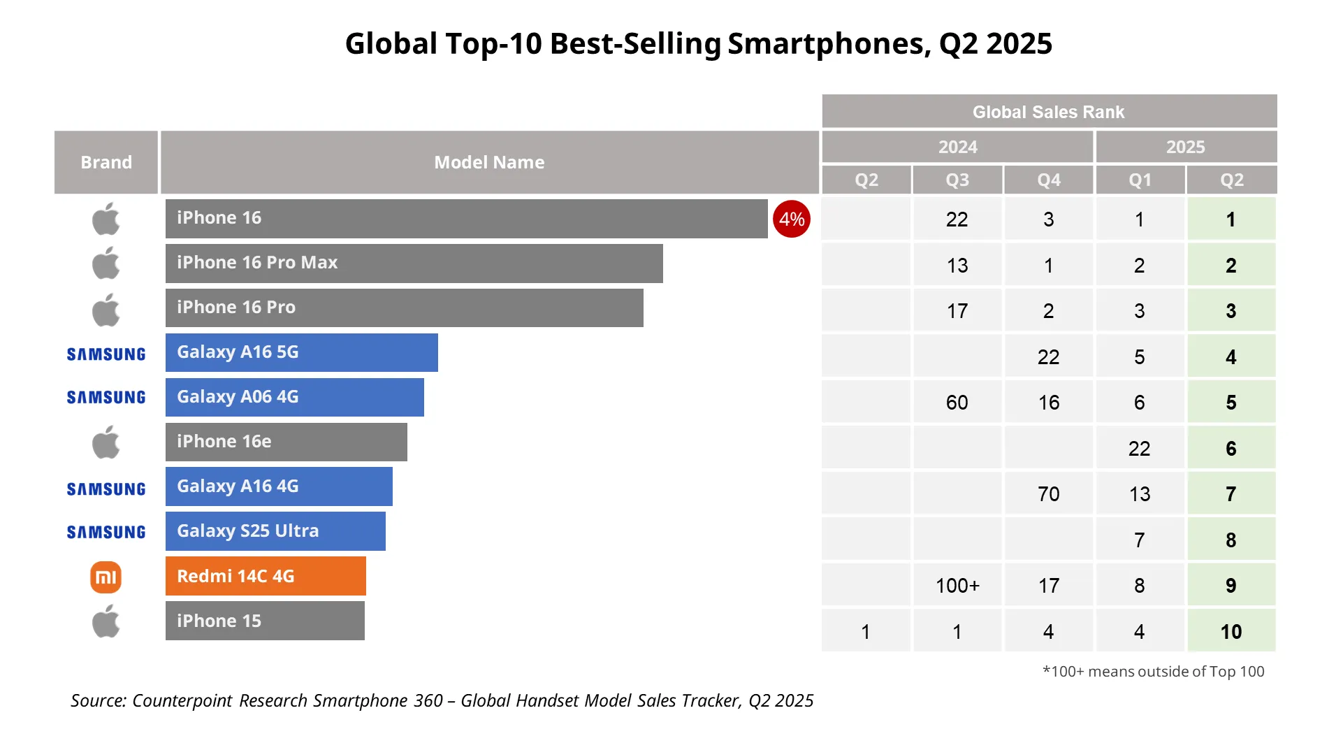 Analitinė agentūra „Counterpoint“ paskelbė 10 populiariausių išmaniųjų telefonų reitingą 2025 m. antrąjį ketvirtį. Trys geriausi modeliai, palyginti su pirmuoju ketvirčiu, nepasikeitė: „iPhone 16“, „iPhone 16 Pro Max“ ir „iPhone 16 Pro“. Pirmasis modelis užėmė 4 % visos išmaniųjų telefonų rinkos, o „profesionalai“ – apie 3 %.