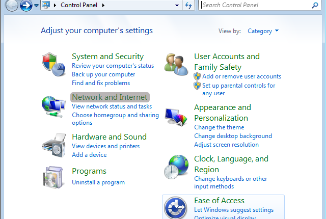 O štai Windows 7 tai padaryti labai paprasta ir visa procedūra užtrunka trumpiau nei minutę. Iš pradžių tereikia spustelėti Start mygtuką ir pasileisti Control Panel. O tada paspausti ant Network and Internet: