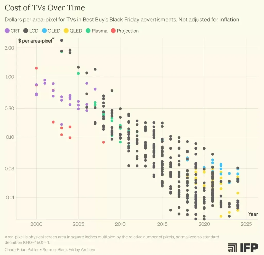 Per pastarąjį ketvirtį amžiaus JAV atlikta „Juodojo penktadienio“ reklamų analizė rodo, kad vidutinė LCD televizorių kaina nuo 2000 m. sumažėjo daugiau nei 90 %, net ir atsižvelgiant į žymiai padidėjusį ekranų dydį ir skiriamąją gebą.