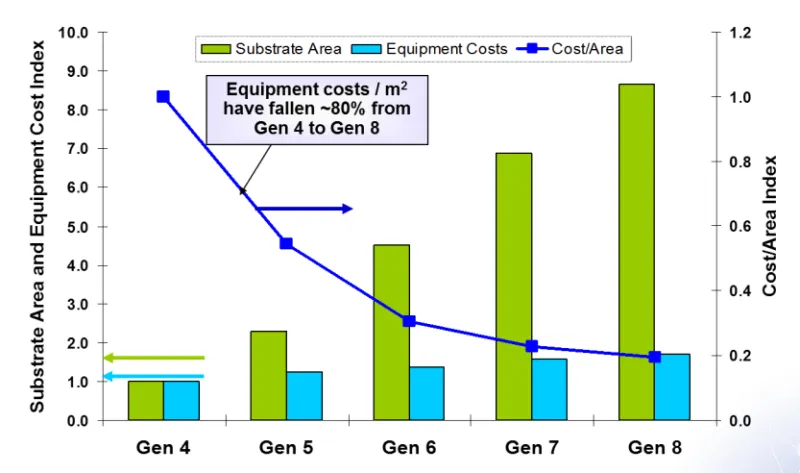 Vienas iš veiksnių, leidusių gamintojams ženkliai sumažinti televizorių sąnaudas, buvo puslaidininkių pramonės metodų ir strategijų taikymas. Lustų gamintojai sumažino sąnaudas gamindami didesnes silicio plokšteles, o tai leido jiems pagaminti daugiau lustų per vieną ciklą. LCD gamintojai taikė panašų metodą, padidindami „motininio stiklo“ lakštų, iš kurių pjaunamos plokštės, dydį – beveik 100 kartų nuo 1990 m. Tai žymiai sumažino įrangos sąnaudas ir leido palaikyti gamybą platesniame ekranų dydžių diapazone.