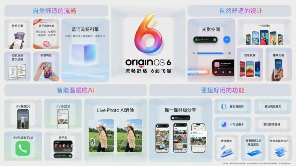 „Vivo“ Kinijoje pristatė „OriginOS 6“ vartotojo sąsają. Pagrindinė jos naujovė – atnaujintas dizainas, akivaizdžiai įkvėptas „Apple iOS 26“ skysto stiklo stilistikos. Animacijos tapo dar sklandesnės, papildytos elastingumo efektais, o personalizavimo galimybės išplėstos dėl naujų lanksčių pritaikymo įrankių.