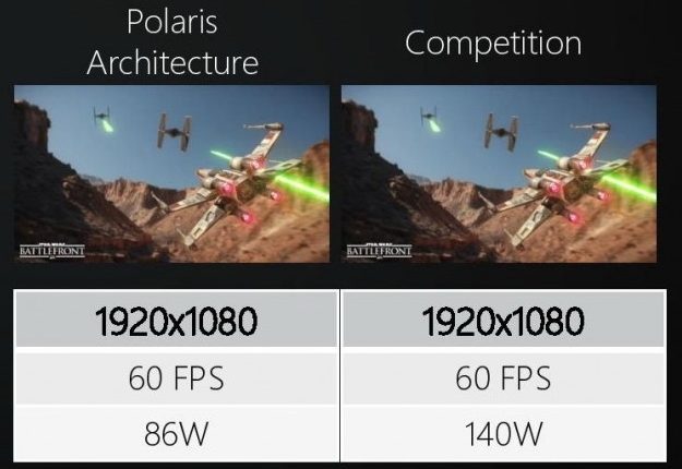 Grafikos branduolys su nauja architektūra „AMD Polaris 11“ gamintojo hierarchijoje yra žemiau už 10 numerį. „Polaris 10“ naudojančius sprendimus bus galima įsigyti birželio pabaigoje, o pristatyti jie bus parodoje „Computex 2016“. Tikimasi, kad „Ellesmere Pro“ konfigūracijos (ATI Radeon R9 490) „Polaris 10“ gaus 2304 stream procesorius su modernia architektūra, o „Ellesmere XT“ (ATI Radeon R9 490X) specifikacijos tebėra paslaptis. Tačiau „Polaris 11“ pagrįsti sprendimai taip pat yra įdomūs, bent dėl savo energijos vartojimo efektyvumo. Būtent šią architektūrą „Advanced Micro Devices“ palygino su „GeForce GTX 950“ žaidime „Star Wars Battlefront“, kur naujiena ir laimėjo didžiuliu skirtumu: 86 prieš oponento 140 vatų, esant tokiam pat kadrų per sekundę dažniui.