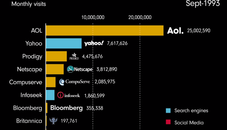 Šveicarų verslininkas ir tinklaraštininkas Jamesas Eagle’as palygino mėnesinius apsilankymo populiariose svetainėse nuo 1993 m. sausio mėn. iki 2022 m. sausio duomenis ir juos vizualizavo.
