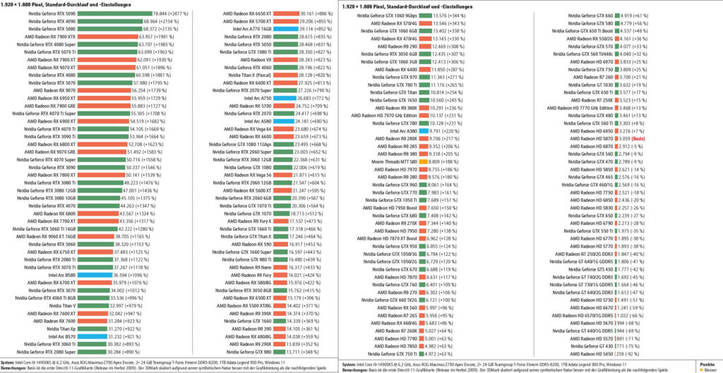 Bandymams PCGH naudojo optimizuotą sistemą, pagrįstą flagmanu „Core i9-14900KS“, veikiančiu 6,2 GHz dažniu, kad sumažintų procesoriaus apribojimus. Testai buvo atlikti 1080p raiška, tačiau kai kurie žaidimai, kaip parodė praktika, vis dar riboja šiuolaikinių vaizdo plokščių galimybes. Testo pagrindas yra pirmoji vaizdo plokštė, palaikanti „DirectX 11“, „Radeon HD 5870“. Žemiau pateikiama visa diagrama, rodanti našumo skirtumus (spustelėkite, kad atidarytumėte ją visu dydžiu).