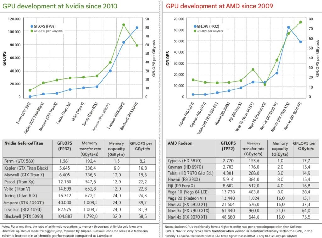 Iki 2025 m. RDNA 4 architektūra pagerino spindulių sekimą, tačiau nepagerino rastrinio našumo. „Nvidia“ perėjimas prie „Blackwell“ iš „Ada Lovelace“ suteikė žymiai mažiau našumo padidėjimo nei ankstesniuose cikluose, o dabar svarbesnį vaidmenį atlieka kadrų generavimo technologija. „Intel“ taip pat pasirodė diagramose: „Arc“ plokščių serija išsiplėtė nuo vieno „Arc A380“ modelio iki kelių vidutinės klasės sprendimų, parodydama, kaip tvarkyklių optimizavimas ir API palaikymas laikui bėgant veikia našumą.