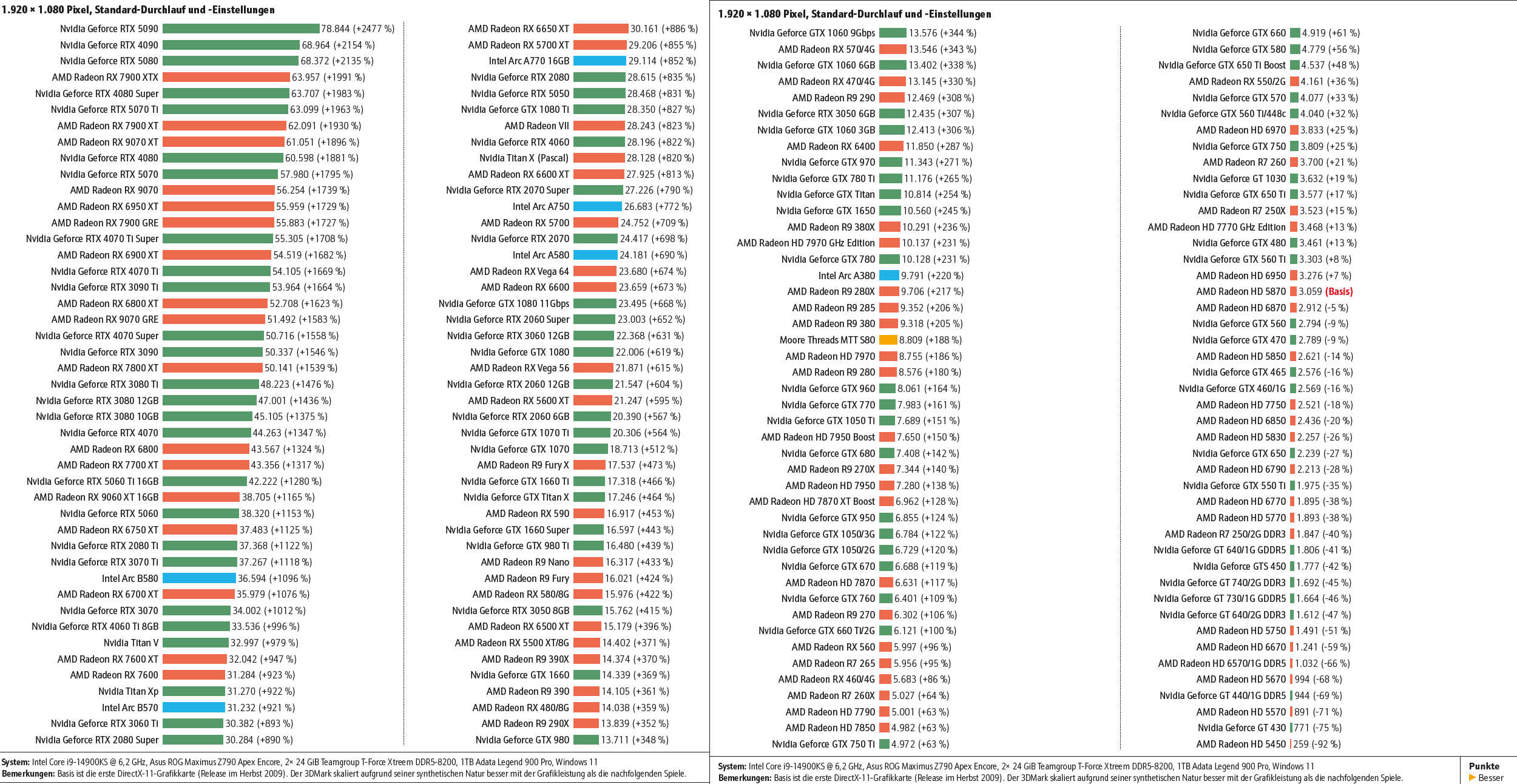 Bandymams PCGH naudojo optimizuotą sistemą, pagrįstą flagmanu „Core i9-14900KS“, veikiančiu 6,2 GHz dažniu, kad sumažintų procesoriaus apribojimus. Testai buvo atlikti 1080p raiška, tačiau kai kurie žaidimai, kaip parodė praktika, vis dar riboja šiuolaikinių vaizdo plokščių galimybes. Testo pagrindas yra pirmoji vaizdo plokštė, palaikanti „DirectX 11“, „Radeon HD 5870“. Žemiau pateikiama visa diagrama, rodanti našumo skirtumus (spustelėkite, kad atidarytumėte ją visu dydžiu).