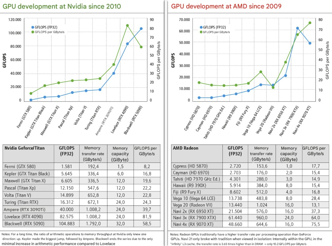 Iki 2025 m. RDNA 4 architektūra pagerino spindulių sekimą, tačiau nepagerino rastrinio našumo. „Nvidia“ perėjimas prie „Blackwell“ iš „Ada Lovelace“ suteikė žymiai mažiau našumo padidėjimo nei ankstesniuose cikluose, o dabar svarbesnį vaidmenį atlieka kadrų generavimo technologija. „Intel“ taip pat pasirodė diagramose: „Arc“ plokščių serija išsiplėtė nuo vieno „Arc A380“ modelio iki kelių vidutinės klasės sprendimų, parodydama, kaip tvarkyklių optimizavimas ir API palaikymas laikui bėgant veikia našumą.