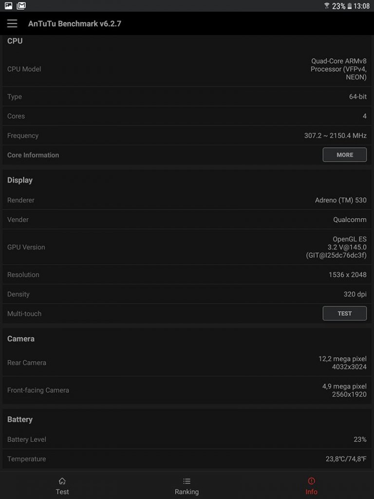 Baterijos talpa santykinai maža – 6000 mAh, ir dėl to planšetės autonomija nėra rekordinė – per 10 minučių žaidimo „WOT Blitz“ (aukščiausi nustatymai) įkrovimo lygis sumažėjo apie 5%. Sintetinis testas patvirtina vidutinę autonomiją: