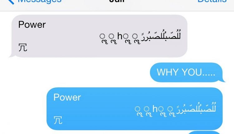 Operacinėje sistemoje „Apple iOS“ aptikta klaida, kuri leidžia iš naujo paleisti svetimą „iPhone“, tiesiog siunčiant tekstinį pranešimą su simbolių kombinacija „Powerلُلُصّبُلُلصّبُررً ॣ ॣh ॣ ॣ 冗“ per „iMessage“ programą arba SMS. Išmanusis telefonas savaime išsijungs ir vėl įsijungs, jei pranešimuose nebuvo įjungtas pokalbis šios žinutės gavimo metu. Veikianti programa taip pat neapsaugo nuo problemos: ji „užlūš“ bandant pereiti į pokalbių sąrašą.