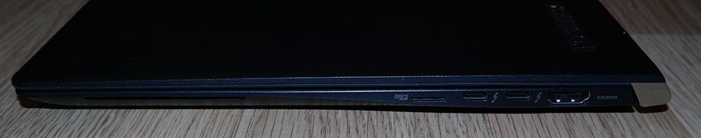Nors kai kurie itin ploni nešiojamieji kompiuteriai dažnai negali pasigirti gausiu jungčių rinkiniu, apie „Toshiba Portege X30“ to pasakyti negalima. Kairėje korpuso pusėje rasite apsauginio užrakto „Kensington“ jungtį, 3.5 mm ausinių ir USB 3.0. Tuo tarpu dešinėje įtaisytas pilno dydžio HDMI, microSD kortelių ir du USB 3.1 Type-C lizdai su „Thunderbolt 3“ palaikymu. „Thunderbolt 3“ yra labai universali sąsaja ir leidžia prijungti didelės raiškos ekranus, eGPU, greitus išorinius įrenginius ir dar daugiau. Nešiojamas kompiuteris įkraunamas per vieną iš šių jungčių.