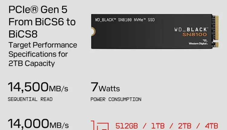 „WD Black SN8100“ bus pirmasis PCIe 5.0 SSD šioje serijoje ir perims „SN850X“, vieno iš PCIe 4.0 kaupiklių lyderių, vietą. Nurodyti 14,9 GB/s skaitymo ir 14 GB/s rašymo greičiai pranoksta „Samsung“, „Kingston“ ir „Crucial“ PCIe 5.0 konkurentus. Atsitiktinių operacijų testuose (2,3 mln. IOPS) jis nusileidžia tik „Samsung 9100 Pro“ su patentuotu „Presto“ valdikliu.